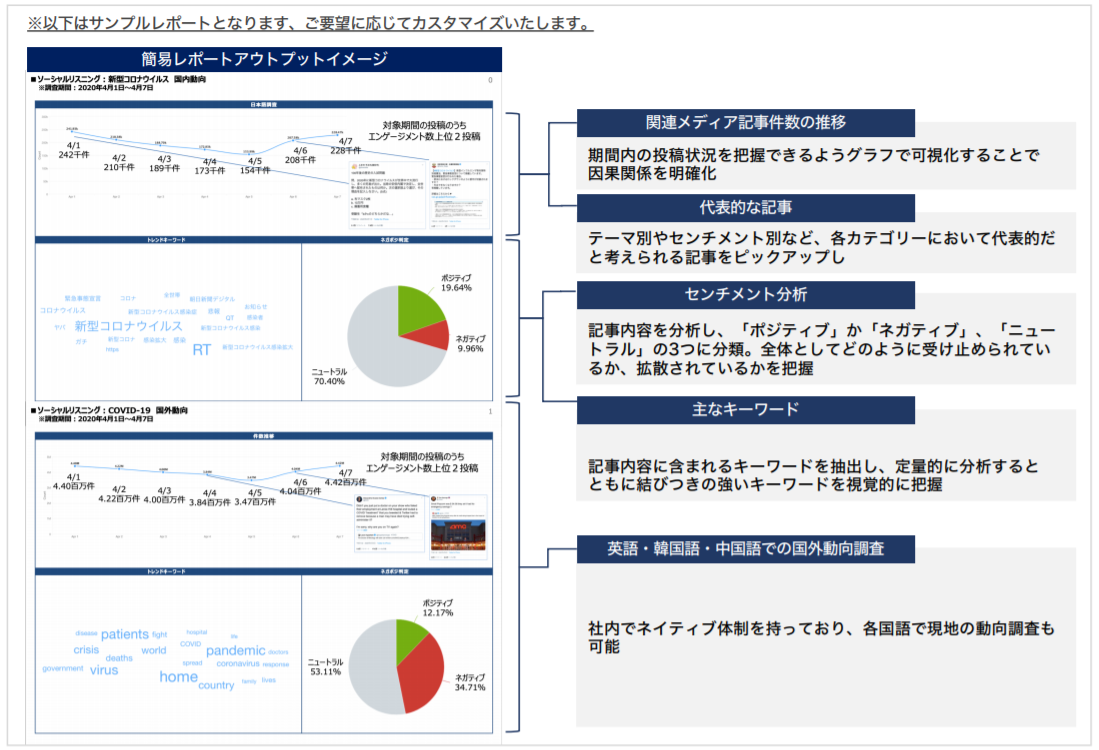 本サービスでは、期間や対象国、さらには言語を指定したうえで、特定のキーワードが含まれるニュース記事やSNS投稿を収集し、国内外の報道論調や口コミの調査を行います。時系列に沿って話題量の推移や内容の傾向を把握することができるため、商品・サービスの売上や集客の変化などをはじめ、新型コロナウイルス感染症によるさまざまな影響への対策を検討するための有益な情報を取得することができます。